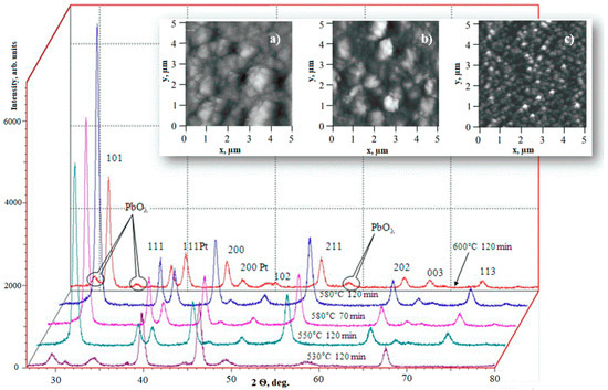 Figure 2) that, even in the original stoichiometric PZT film, under certain conditions (temperature above 580 °C, duration greater than 70 min), impurities of lead oxide could be formed. This was because the thermal treatment led to partial decomposition of the PZT grain with the removal of the most active oxide (i.e., lead oxide) based on the following reaction: