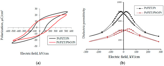 ε = 410). The CV characteristic of the sample without the sublayer was symmetrical and had a control ratio of 2.8, while the CV characteristic of the sample with the sublayer was not symmetrical and was shifted by approximately 0.7 V towards positive voltages; the control ratio was 2.4. PZT films without a sublayer and with PbO were characterized by residual polarization of 13 and 11 µC/cm