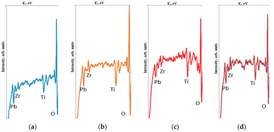 The magnitudes of the coercive fields and the residual polarization of the PZT films were determined from the dielectric hysteresis loops obtained by the Sawyer Tower method. The values of the dielectric constant and the tan delta angle or the dissipation factor were determined by means of an E7-12 immittance meter (Tetron, Moscow, Russia) at a frequency of 1 MHz. Investigation of the morphology of the surface layers was performed on an atomic-powered microscope (NT-MDT Spectrum Instruments, Zelenograd, Russia) with a resolution of 10 nm in the horizontal plane of the film under test and with no less than 1 nm in the vertical. The microstructure layers were investigated by SEM on a system supplied by the Helios Nanolab D449 FEI Company, Hillsboro, OR, USA. Investigations of the elemental composition were carried out on an ECO-3 Auger spectrometer (Burevestnik, St. Petersburg, Russia). The main technical parameters of the equipment were as follows: vacuum in the measuring chamber, <10−9 mm Hg; energy of the primary electrons, 3 keV; electron probe diameter, 5 μm; electron probe current, 5 × 10−7 A; resolution factor (E/dE), 250. The phase composition of the samples was studied using X-ray diffraction on a Shimadzu XRD 6000 diffractometer, Shimadzu Corp., Kyoto, Japan. The identification of the phases was carried out using the X-ray analysis database Powder Diffraction File.