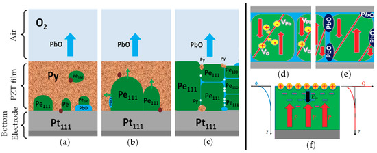 Figure 8f). The release of lead ions to the surface was associated with the formation of negatively charged vacancies in the bulk of PZT. Thus, a double charged layer was formed. Oxygen ions and oxygen vacancies partially compensated for these charges, but not completely, since the formation energies of oxygen and lead vacancies in PZT were very different. The enthalpy of formation of an ionized vacancy in oxygen was 5.4 eV and in lead was 3.3 eV.