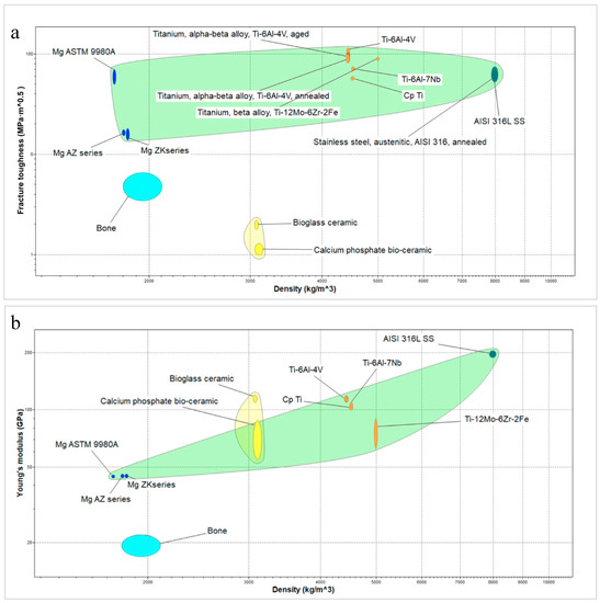 (a) Fracture toughness and density; (b) elastic modulus and density of bone, coating materials and most common metallic materials used in orthopedics and implant dentistry. Data elaborated using CES EduPack™ 2018.