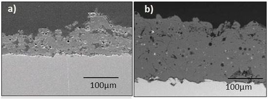 SEM micrographs of the cross section of: (a) wollastonite and (b) wollastonite-diopside glass ceramic coatings deposited on Ti-6Al-4V substrate, from Garcia et al., 2018 [146].