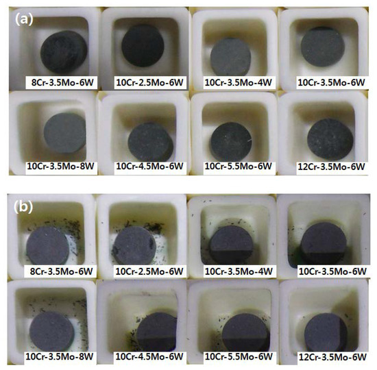 From the images of the (8–12)Cr–3.5Mo–6W alloys shown in Figure 5b, f and h, it is noted that the size of Al2O3 particles was larger in the alloys with lower Cr content. The high Cr content and the relatively low temperature as 850 °C are thought to be favorable for preferential formation of a stable Cr2O3 layer and hence Al2O3 might grow slowly due to the low diffusion of oxygen. The mass gain (Figure 3a) decreased with the increase in Cr content up to 10 wt.%, beyond which it then increased. These results imply that the oxidation resistance depends largely on the protectiveness of the Cr oxide layer at 850 °C but Al oxide plays an important part as well.