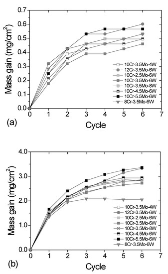 The weight of the alloys increased with oxidation, as shown in Figure 2. The mass gain after six cycles of oxidation at 850 °C was 0.46~0.62 mg/cm2. The oxidation rate was relatively high in the initial cycles and then gradually reduced with successive cycles. The weight of a specimen increased quickly when the oxide layer formed on the bare surface. The oxidation rate slows down after the initial stage, because the rate of oxide growth is controlled by the diffusion of oxygen and alloying elements in the oxide scale, as implied by the parabolic trend of the curves. The final mass gain at 1000 °C was 2.0~3.4 mg/cm2, much higher than that measured at 850 °C. The mass gain curves indicate continued growth of the oxide scale, except in the case for the 8Cr–3.5Mo–6W alloy at 1000 °C. The mass gain of 8Cr–3.5Mo–6W increased up to the third cycle but thereafter it became nearly constant. This is thought to be related to the volatilization of Cr hexavalent oxide. Severe spallation of scale on 8Cr–3.5Mo–6W, as seen in Figure 1, may also be a reason that no further increase of mass gain. Because we did not use any cover on the alumina crucible, part of the spalled oxide could have been lost during the tests.