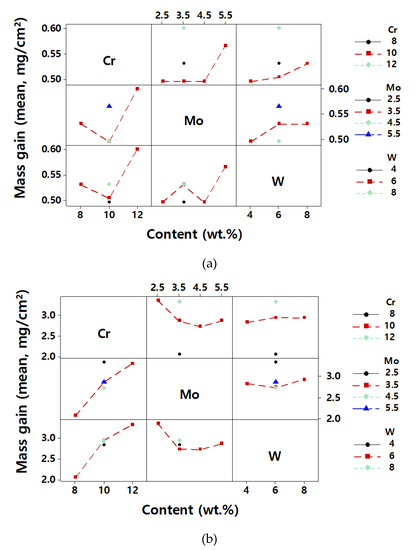 Final mass gain as a function of Cr, Mo, and W contents (a) at 850 °C and (b) at 1000 °C.