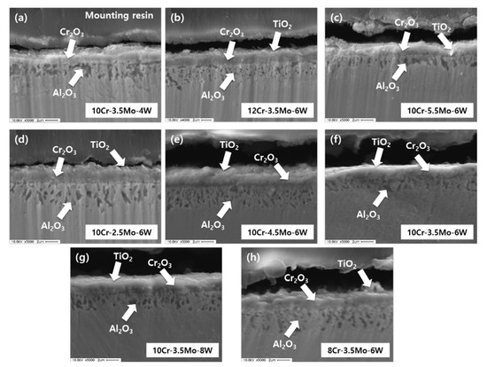 Cross-sectional image of (a) 10Cr–3.5Mo–4W, (b) 12Cr–3.5Mo–6W, (c) 10Cr–5.5Mo–6W, (d) 10Cr–2.5Mo–6W, (e) 10Cr–4.5Mo–6W, (f) 10Cr–3.5Mo–6W, (g) 10Cr–3.5Mo–8W, (h) 8Cr–3.5Mo–6W alloys oxidized at 850 °C.