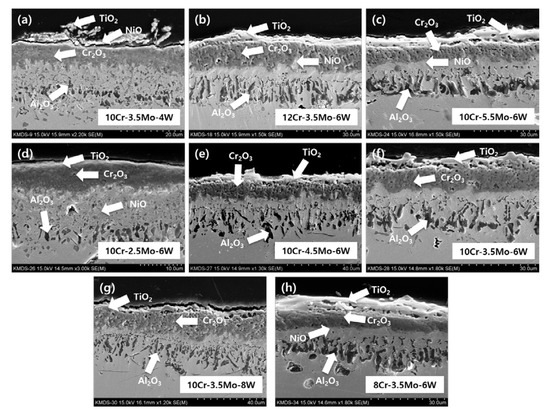 Cross-sectional image of (a) 10Cr–3.5Mo–4W, (b) 12Cr–3.5Mo–6W, (c) 10Cr–5.5Mo–6W, (d) 10Cr–2.5Mo–6W, (e) 10Cr–4.5Mo–6W, (f) 10Cr–3.5Mo–6W, (g) 10Cr–3.5Mo–8W, (h) 8Cr–3.5Mo–6W alloys oxidized at 1000 °C.