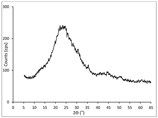 The mineral composition of the waste was analyzed with the powder method on the fraction of material smaller than 75 μm. The analysis indicated that amorphous silica SiO2 constitutes the dominant component, which was identified by a significant background increase at 2θ 15°–35° (Figure 1). The organic carbon bonds that did not form crystalline mineral phases remained unidentified in an investigation conducted with the XRD method.