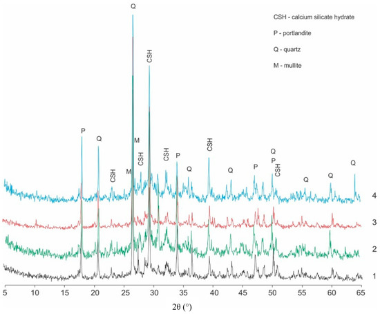 X-ray diffractograms of cement paste of (1) CI.0; (2) CI.1; (3) CII.0; and (4) CII.1 concretes.