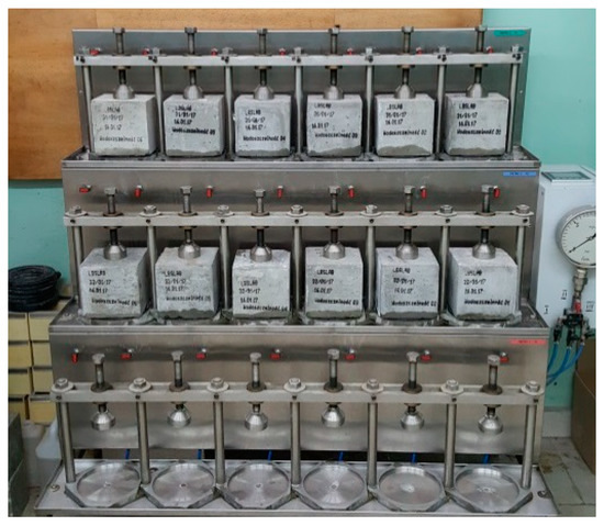 The samples for the water absorption test were suspended on a 10 mm mesh above the bathtub bottom and then poured with water up to half of their height. After 24 h, the water level was increased until it was 10 mm above the samples. After each subsequent 24 h, the samples were removed from water, their surfaces dried and then weighed. The concrete samples were saturated until the two consecutive weighings showed no mass increase. Following saturation, drying to constant mass and weighing of the samples were conducted, then the volumetric density and water absorption by weight which characterized the concrete were indicated in line with the PN-B-06250 standard [43].