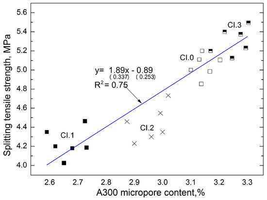 The graphs (Figure 6) show the dependence of the different properties of CI concrete. The dependence of A300 micropore content on the splitting tensile strength for concrete is shown in Figure 6. In this study, the determined micropore content directly corresponds to the splitting tensile strength of concrete CI. The linear trend was characterized by a coefficient of correlation R2 = 0.75 and relatively low errors in the intercept. The error is considered to be small if the quotation estimator standard error and the estimator is less than 30%. In the first case it is 17% and in the second it is 28%.