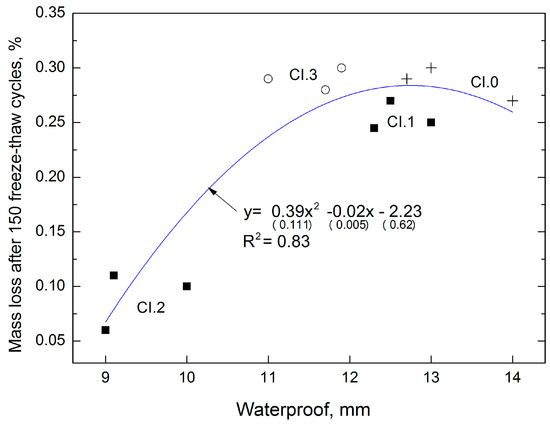Dependence between water-tightness and mass loss after 150 freeze–thaw cycles of CI concrete.