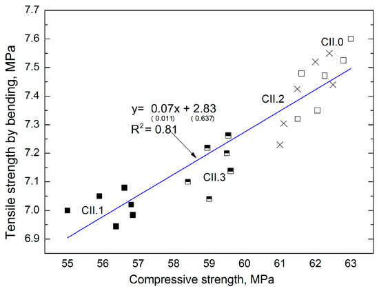 The above-mentioned dependences were not observed in the concretes with CII cement. In turn, good correlation was obtained between the compressive strength and tensile strength in bending (Figure 8). The linear function allows a good coefficient of determination, equal to 0.81 and low errors in the intercept (respectively 14.5%, 22.5%).