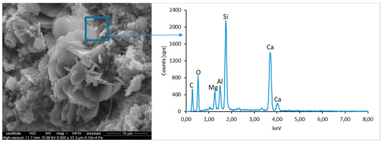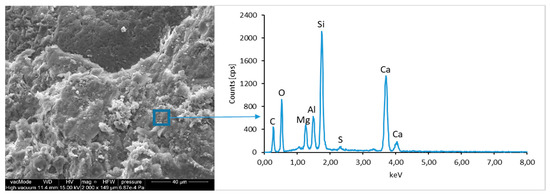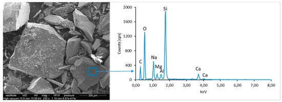 The morphology of lightweight aggregates and their porous structure was determined using scanning electron microscopy (SEM). The observation was carried out by means of FEG Quanta 250 microscope (FEI, Hilsboro, OR, USA) equipped with an energy dispersive spectroscopy (EDS)-based system by EDAX for chemical composition analysis. The powder samples for SEM investigations were glued to a carbon holder using carbon glue. Then, the preparations were sputter coated with an approximately 50 nm layer of carbon in order to achieve conductivity on the sample surface.