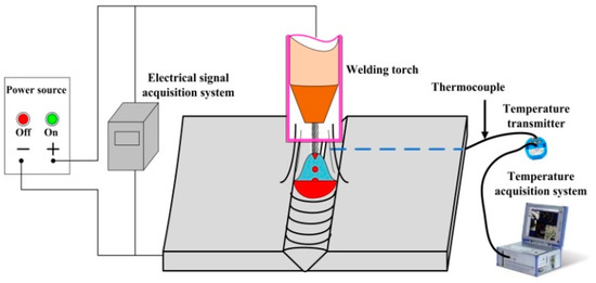 Welding trials for the different HNASSs were conducted. The equipment system for the welding trials is presented in Figure 2. The main system components consisted of a power source, welding torch, electrical signal acquisition system, thermocouple, and temperature acquisition system. The EWM welding power source was operated in direct current electrode positive (DCEP) condition, and a shielding gas of 97.5% Ar + 2.5% CO2 was used in the welding process. The welding parameters for HNASSs were kept consistent, as presented in Table 2. The current and voltage waveforms were obtained by using an electrical signal acquisition system with a sampling rate of 100 kHz. Moreover, a DEWETRON (Graz, Austria) temperature acquisition system was used to obtain the welding thermal cycle curves. The type K thermocouples with a range from 0 to 1100 °C were glued to the bottom surface using aluminium tape, and the distance from the weld seam centre was 6 mm.