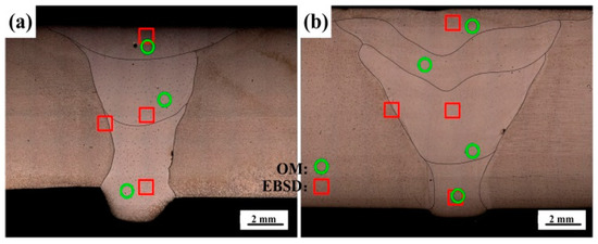 After welding, three tensile test samples for 1670-8 and 1670-14 were cut perpendicularly to the welded joints, respectively. The tensile tests were conducted using an electromechanical universal testing machine (CRIMS DDL300, Changchun, China) at a strain rate of 0.5 s−1, and the fracture surfaces were observed using scanning electron microscopy (SEM; ZEISS Supra 55, Jena, Germany). The transverse sections of the welded joints with different thicknesses are presented in Figure 3. It is observed that the welded joints of 1670-8 and the 1670-14 are composed of three passes and four passes, respectively. The chemical compositions of weld seam were measured by X-ray fluorescence spectrograph (Axios, Panako, Almelo, The Netherlands), and nitrogen contents were measured by Oxygen and Nitrogen Analyzer (EMGA-820, HORIBA, Kyoto, Japan), as shown in Table 1. The microstructures of the welded joints were characterised with optical microscopy (OM, OLYMPUS BX51M, Olympus, Tokyo, Japan) and the EBSD (SYMMETRY, Oxford Instruments, Abingdon, UK) system equipped with an SEM. The locations observed were marked in Figure 3, and the red boxes indicate the location of the EBSD study and green cycles indicate the OM study. The OM samples were machined from the welded joints, ground, mechanically polished, and etched in a mixed reagent of HCl and HNO3 (3:1) for 30 s. The EBSD samples were prepared by grinding, mechanically polishing, and electrolytically polishing in a reagent of ethyl alcohol and perchloric acid (15:85, volume fraction) at 20 V for 15 s. EBSD was carried out using in a fine step size of 5 μm and a scanning area of 231 × 173 μm2 and a fine step size of 0.2 μm and a scanning area of 80 × 80 μm2. For the identification of precipitates and the investigation of a deformation mechanism, transmission electron microscopy (TEM; JEM-2100, JEOL, Tokyo, Japan) was applied.