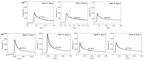 Thermal cycle curves for each pass during welding for the (a) 1670-8 and (b) 1670-14.