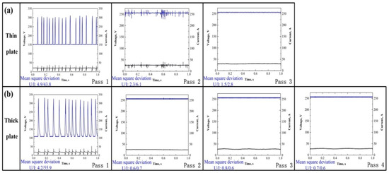 Electrical signal oscillograms for the (a) 1670-8 and (b) 1670-14. U/I represents the square deviation value of the thin and thick plates in 1 s.