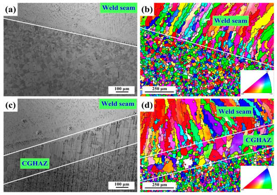 The OM and EBSD maps of the welded joints are observed in Figure 6. The base metal is composed of equiaxed austenite, and the weld seam is composed of columnar austenite and dendritic δ-ferrite. Following the welding thermal cycles, the weld seam produces a preferential growth of columnar grains. The grains of the base metal in the vicinity of the fusion line are affected, and the recovery and recrystallisation occur. High heat input is in favour of the growth of columnar grains and the formation of a coarse-grained heat-affected zone (CGHAZ). Therefore, 1670-14 has larger columnar grains, and the CGHAZ is produced due to the local high heat input of the base metal. The maximum width of the CGHAZ is 240 μm. As 1670-8 has low heat input, the CGHAZ is not formed.