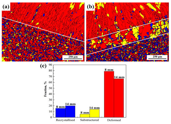 Recrystallised grain distribution diagram for (a) 1670-8 and (b) 1670-14, and (c) the fraction of grains for the different thicknesses of welded joints.