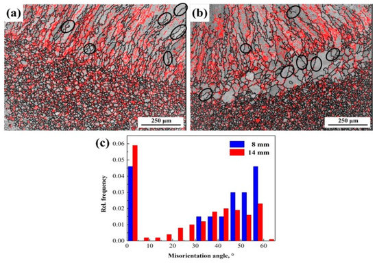 Figure 8a,b represents the grain boundary distributions, and red line describes the low angle grain boundaries (LAGBs) (2°–15°). The black line describes the high angle grain boundaries (HAGBs) (>15°). Figure 8c shows the relative frequency (Rel. frequency) of misorientation angle. The welded joint of 1670-14 presents a higher percentage of LAGBs in the selective area (32.4%) than that of 1670-8. The regions with a high percentage of LAGBs indicate a high degree of sensitization to concentration of dislocation density. Parts of HAGBs are marked in the black cycle. From Figure 7 and Figure 8, it can be deduced that most of the recrystallised grains are formed along the HAGBs. Mccabe et al. [22] also reported that recrystallisation occurs because of the motion of HAGBs and the nucleation is preferentially formed close to HAGBs. High heat input and number of welding passes improve the formation of recrystallized grains along HAGB.