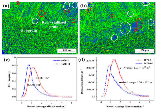 (a) Kernel average misorientation (KAM) map of 1670-8, (b) KAM map of 1670-14, (c) KAM distribution, and (d) dislocation density.