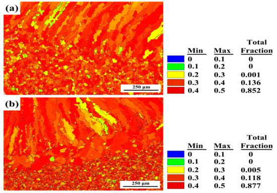 The grains of the welded joints change after the welding. When the average angle of a grain is greater than 3°, the grain is called a deformed grain. When the average angle is smaller than 3°, and the misorientation angle between grains is greater than 3°, the grain is called subgrains. The interface between adjoining grains is called sub-boundaries. The remaining grains are called recrystallised grains. From Figure 7a,b, it can be observed that the deformed grains gather in the weld seam, and the weld seam has few subgrains and recrystallised grains. The subgrain fraction of 1670-14 is higher than that of 1670-8 in the weld seam. Moreover, the recrystallised grains form along the deformed grains, which mainly results from the high driving force of nucleation in the deformed grains. The CGHAZ of 1670-14 is mainly composed of subgrains and deformed grains. According to Figure 7c, the percentages of recrystallised grains, subgrains, and deformed grains for 1670-14 is 20%, 14%, and 66%, respectively; while 1670-8 due to the lower heat input and the lesser number of passes, presents a higher percentage of deformed grains (79%) and a lower percentage of subgrains (5%). In fact, the fraction of sub-boundaries rises with the increase of subgrains. Lu et al. [21] reported that the high sub-boundary fraction reflects the high dislocation density.