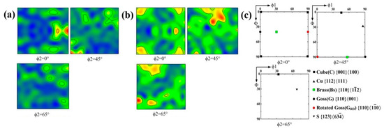 Orientation distribution function sections of Euler’s space for the (a) 1670-8, (b) 1670-14, and (c) standard orientation distribution functions (ODFs) for FCC material.