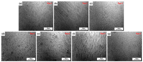 Weld seam microstructures of plates of different thicknesses at each pass, (a–c) for 1670-8 and (d–g) for 1670-14.