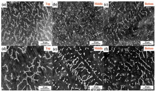 The effect of welding thermal cycles on microstructure was further studied, and amplified microstructures of weld seams from top to bottom were obtained in Figure 13. According to the aforementioned, solidification of the weld seam occurs in primary the ferrite mode. When the cooling rate is high, the transformation of primary δ-ferrite into austenite is inhibited. Furthermore, thermal cycles of other passes can improve the transformation of δ-ferrite in pass one, and have no effect on the top. For the top of welded joints, 1670-8 has the low heat input and cooling rate. However, the top of 1670-8 has a higher fraction of δ-ferrite, which indicates that the fraction of δ-ferrite increases with the decreasing of the heat input. For the bottom of welded joints, the highest cooling rate and the lowest heat input should produce the highest fraction of δ-ferrite, but thermal cycles in other passes improve the change from network δ-ferrite to rod and granular δ-ferrite, as shown in Figure 13.