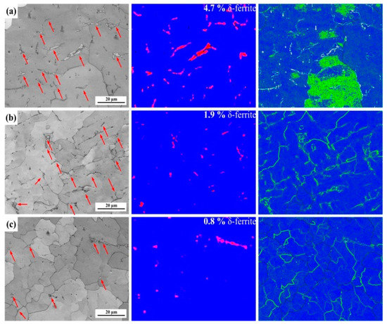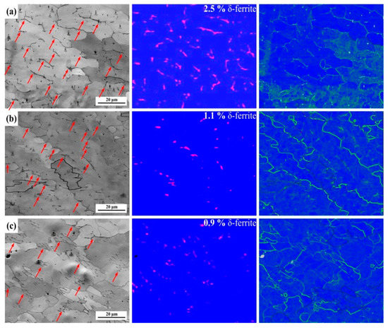 In order to investigate the local misorientation of δ-ferrite, the weld seam was observed through EBSD in a fine step size of 0.2 μm and a scanning area of 80 × 80 μm2. Figure 14 shows the contrast maps, phase maps, and KAM maps of 1670-8 in the weld seam. The microstructures are composed of δ-ferrite and columnar austenite. The δ-ferrite is marked with red arrows in the contrast maps, and the corresponding phase distribution maps show the fractions and distributions of the δ-ferrite (red) and austenite (blue). The KAM maps reveal the relatively higher dislocation density along the δ-ferrite boundaries compared to the austenite boundaries. Thermal cycles of other passes result in the occurrence of recrystallisation and the transformation of δ-ferrite, so the dislocation density also increases from bottom to top. Figure 15 shows the contrast maps, phase maps, and KAM maps of 1670-14 in the weld seam. Similarly, the dislocation density increases from bottom to top, and the boundary of the δ-ferrite has a higher dislocation density than that in grains. The middle and bottom dislocations mainly occur in the boundaries, but the top austenite grains also have a high dislocation density. Compared to the weld seam of 1670-14, the weld seam of 1670-8 contains larger fraction of δ-ferrite due to the low heat input. Nage et al. [32] have found that the mechanical properties increase with the decreasing of δ-ferrite in weld seam.
