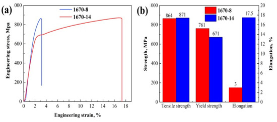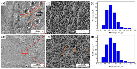 Figure 18 presents the fracture surface of the tensile samples. Figure 18a,d represents the low magnitude fracture morphologies, and Figure 18b,e represent the corresponding amplified morphologies of the red boxes. The typical ductility fracture features with dimples are shown in the fracture surfaces of 1670-8 and 1670-14, but the fracture micrograph of 1670-14 presents relatively flat and homogeneous dimples. Deep and large holes marked in the cycle are formed in the fracture surface of 1670-14. The dimple sizes of fracture surfaces were measured, as shown in Figure 18c,f. The average dimple sizes of 1670-8 and 1670-14 are 1.12 ± 0.38 μm and 1.16 ± 0.38 μm, respectively. Furthermore, fracture morphologies also show that the ductile tearing cracks lead to the damage of 1670-8, while the damage of 1670-14 results from the coalescence of voids. Hence, 1670-14 has better ductility than 1670-8.