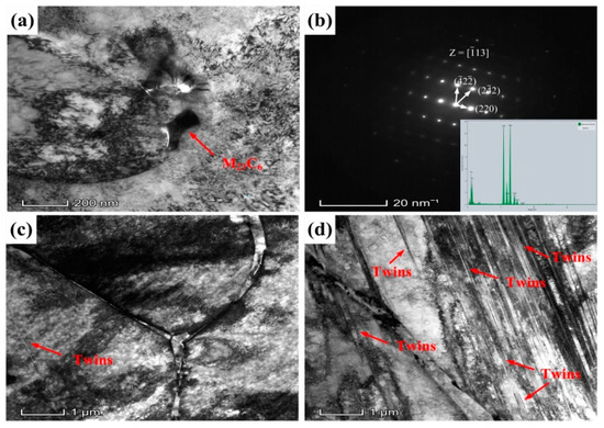 To evaluate the strength and ductility of the welded joints, tensile tests were conducted at 25 °C. A fracture occurred in the weld seam. The tensile stress–strain curves are presented in Figure 16a, and it is observed in Figure 16b that the welded joint of 1670-14 has higher elongation and tensile strength and the difference in tensile strengths of the two welded joints is not significant. As shown in Figure 9, the welded seam of 1670-14 presents a higher dislocation density. It occurs easily for dislocation accumulation and stress concentration. Moreover, the high HAGBs of 1670-8 also represent the preferential crack nucleation sites. On the other hand, Lai et al. [33] reported that cracks initiate preferentially along the austenite/δ-ferrite interface, and high δ-ferrite leads to the elongation loss. After tensile tests, microstructures of welded joints were observed by TEM. Figure 17c,d shows that twins are found in weld seam and 1670-14 has a higher fraction of twins than 1670-8. Twin boundary, as a low energy boundary, has higher strength than random HAGB. Hence, 1670-14 has a higher tensile strength than 1670-8. However, weld seam of 1670-14 has larger grain size for columnar grains after welding under high heat input and cooling rate, which decreases the tensile strength and results in no significant difference in tensile strength. We also found that M23C6 precipitates along grain boundary of austenite/δ-ferrite in weld seam of 1670-8, and grows into austenite matrix, as shown in Figure 17a. Zheng et al. [34] reported that the ductility of the material reduces with the precipitation of M23C6. M23C6 is responsible for the low elongation of 1670-8.