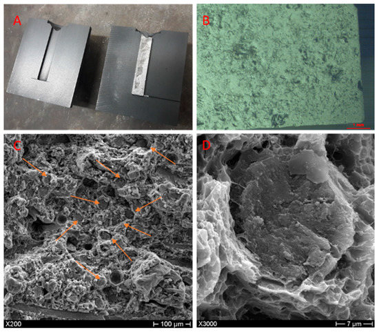 (A) Sample after casting with long fillers. (B) Cutting surface of sample with long fillers. (C) Fracture surface of sample with long fillers. (D) Enlargement of cutting surface in (B).