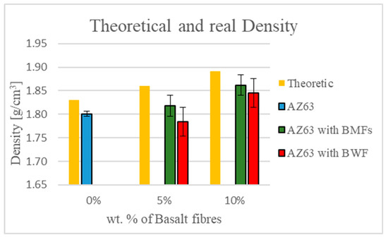 Optical microscopy analysis revealed the presence and good dispersion of the BMFs in the AZ63 specimens. Figure 3 shows, as an example, an image of the sample at 5 wt % after acid attack with concentrated HCl, which was done to make the fibers visible. SEM analysis of the fracture surfaces confirmed the optical analysis results. Moreover, Figure 3 shows that the BMFs were well wetted by the metal matrix and partially aligned in the direction of the casting axis; however, more defects and greater porosity were visible on the fracture surface. The presence of residual porosity was also confirmed by the results obtained from the comparison between the theoretical and measured density. The diagram in Figure 6 shows the comparison between the theoretical and measured density of the manufactured composites, and the composites reinforced with 5 or 10 wt % of both kinds of filler showed, respectively, the residual porosity (reported in Table 2).