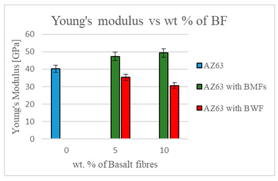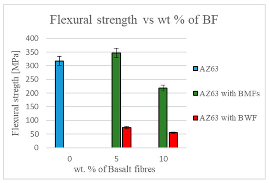 The results reported in Figure 6 and Table 4 also confirm the optical microscopy and SEM analyses. The residual porosity had already been detected in the non-reinforced AZ63 and the AZ63-BMF samples, but a higher residual porosity was present in the composites reinforced with BWF, probably due to the nonhomogeneous impregnation of the fabric. The residual porosity produced effects on the final mechanical properties of the composites, the results of which are reported below.