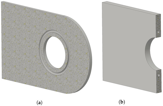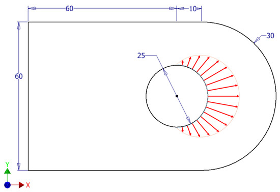 The idea behind this research is to study the impact of the implementation of the eSHM technology in a potential practical application. Since the eSHM is originally targeted at aerospace applications, it has been decided to work on straight lug components. Indeed, this type of connecting element is frequently used in aeronautics, and is also very prone to fatigue failures (fretting and/or corrosion are very likely to initiate a crack) [28]. Amongst the abundant literature on lugs, it was decided to work on the configuration studied by Schijve in [29], where fatigue crack growth experiments have been performed on various aluminum straight lugs (in-plane geometry depicted in Figure 2, thickness of 5 mm) subject to a cyclically varying axial loading. The maximal pin force is kN and the load ratio is . It must be noted that this force is modeled through this entire work as an equivalent pressure having a cosinusoidal distribution on the pin hole surface. Moreover, even though a lug with integrated capillary would be barely impossible to manufacture without resorting to additive manufacturing, the material properties that are used in the present work are similar to the properties of the Al2024-T3 material used in the experimental work done in [29]. These are: a Young’s modulus of 73,000 MPa, a Poisson’s ratio of 0.33, and a yield stress of 368 MPa. It is thus assumed that the material is isotropic, and that the variations of the mechanical properties due to the printing process do not influence the results of the comparison provided the same material properties are enforced in all the models.