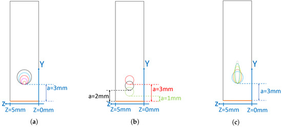 Schematics of the upper cross section of the lug when looking in a YZ plane centered at the lug hole (one can refer to Figure 4b), illustrating the different implementations of the eSHM (capillaries) that have been assessed. In particular, different capillary diameters (a), edge-to-edge distance (b) and aspect ratio’s (c).