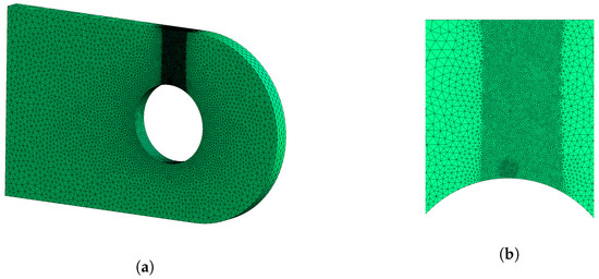All the fatigue crack growth simulations have been performed with Morfeo, developed by Cenaero [33,34]. In the software, the propagation is driven by a user defined crack propagation step . The software then computes the corresponding , number of cycles required to propagate the crack by . One should note that has to be set to a value ensuring that the propagation path is properly computed, and that the time integration yielding the is correctly evaluated. Since the software is based on the XFEM method, the crack position in the mesh is spotted by level sets, which are at each step updated based on propagation length and direction [33,34,35]. All the meshes used in this section have been generated using the open source pre- and post-processor “Gmsh”, developed by Geuzaine and Remacle [36]. They were obtained after several refinement steps, ensuring the use of a converged mesh. The mesh was highly refined in the crack region, and particularly in the initial defect region (see Figure 7), to ensure for converged stress intensity factors on the complete crack path. Depending on the configuration, the mesh totalizes between 850 k and 930 k linear tetrahedron elements.