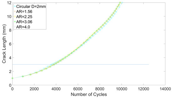 The crack propagation curves obtained for a part-through crack are shown in Figure 11. It can be clearly seen that varying the aspect ratio of the capillary actually has a negligible effect, as the impact on the crack propagation life remains below 2.5% variation (see Table 6). Increasing the aspect ratio of the capillary implies that the local reduction in area felt by the crack is less important than for circular capillaries. Crack propagation speeds in the neighborhood of the capillary are hence lower for elliptical capillaries. However, due to the vertical extension (along the y-axis) of the elliptical capillary, the time frame during which the crack propagates in a reduced available sectional area is also longer. This counterbalances the positive effect of lower propagation speeds, hence explaining why small difference in crack propagation life is obtained.