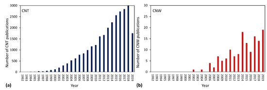Number of publications per year regarding carbon nanotube (CNT) synthesis (a) and carbon nanowall (CNW) synthesis (b). Source: Web of Science.