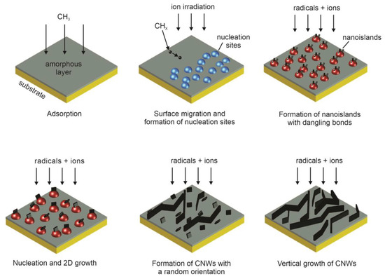 A typical SEM image of CNWs is shown in Figure 2. CNWs were first synthesized more than 10 years ago and can be deposited onto a substrate using a classical plasma-enhanced chemical vapor deposition (PECVD) method [10,11,12,13]. A carbon-containing gas (usually methane CH4 or acetylene C2H2) is partially atomized and ionized upon plasma conditions and the resultant radicals condensate on a substrate surface. Upon limited range of experimental conditions, carbon in the form of nanowalls (multilayer graphene sheets) grows on the substrate surface. The commonly accepted growth mechanism for CNWs is illustrated in Figure 3 and can be summarized as follows [9,14]: