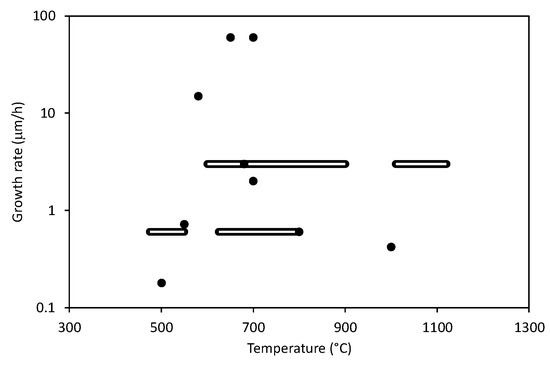 The growth rate versus the temperature as reported in literature shown in Table 1. The dots represent results in the cases when the authors performed experiments at a constant temperature. Some authors reported a range of temperatures during deposition—these results are represented with longitudinal bars.