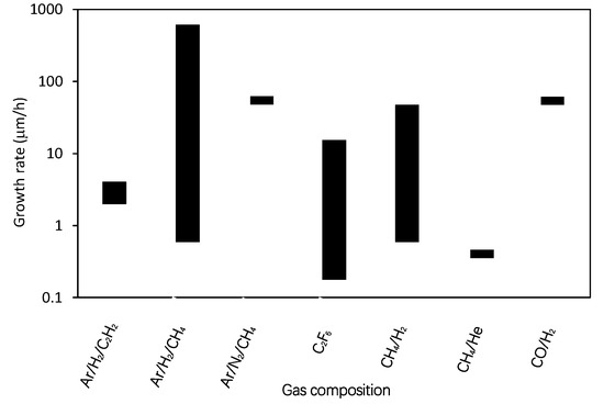 Different authors used different experimental setups so any comparison of results might not be scientifically perfect. Still, it is interesting to draw at least some correlations. Of particular importance is the growth rate versus the parameters reported in literature cited in Table 1. Figure 4 reveals the growth rates (where reported) versus the substrate temperature (where reported), Figure 5 the growth rates for different gas mixtures, and Figure 6 the growth rates for different discharges. As mentioned above the results summarized in Figure 4, Figure 5 and Figure 6 are based on statistical evaluation of available literature from different authors as presented in Table 1.