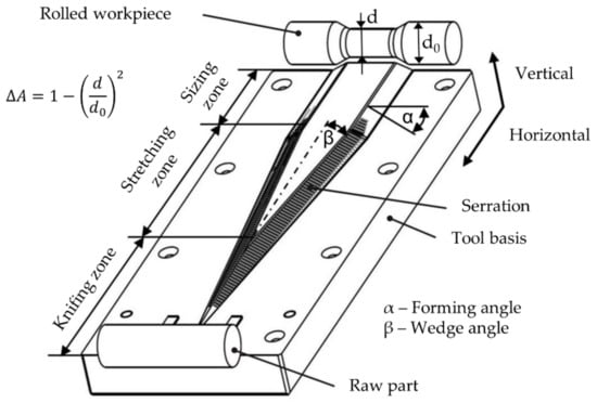 A study on the process stability of cross-wedge rolling processes was performed by Pater et al. []. They were able to define process windows for stable CWR processes depending on the forming angle , wedge angle , and the relative reduction of the workpiece. These process limits were considered in the experimental design of the present paper.