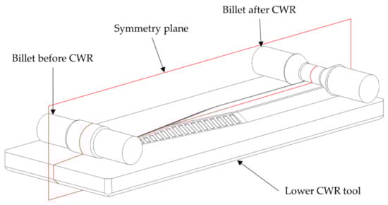 For the simulations of the present investigation the software FORGE NXT 2.1 was used. The CWR process is designed as a flat wedge process with two tools with the coaxially arranged hybrid semi-finished workpiece in the middle. To reduce the simulation time, the setup was mirrored on a symmetry plane (Figure 4).