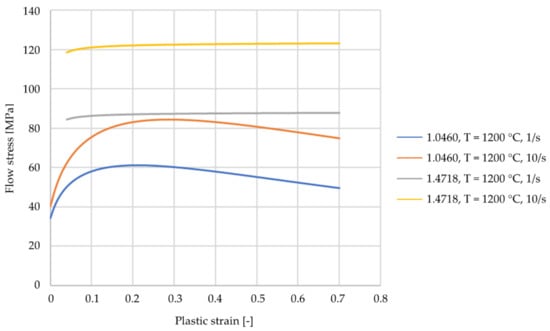 The mechanical properties of the materials are the simplified standard values of the simulation program. They both have a density of , a specific heat of , a conductivity of , and an emissivity of . However, the two materials differ in their flow curves. For the C22.8 (1.0460) the material description is based on the flow curves described by Behrens et al. []. The flow curves were recorded for the strain rates 1/s and 10/s at the temperatures of 600 °C, 750 °C, 900 °C, 1050 °C and 1200 °C. For other strain rates and temperatures, the values are interpolated or extrapolated. The material description for the X45CrSi9-3 (1.4718) is based on the flow curve equation by Hensel and Spittel. Their equation describes the forming behavior depending on the Temperature T, the effective strain and flow behavior and the strain rate . FORGE NXT 2.1 uses a shortened version of the equation (Equation (2)). The necessary parameters are stored within the material database of the program. The parameters for X45CrSi9-3 (1.4718) are shown in Table 2. The flow curves of the two used materials are displayed and compared in Figure 5.
