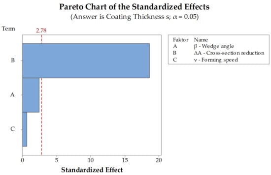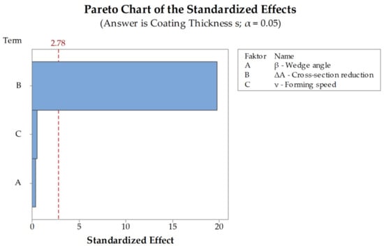 The evaluation of the significance of the investigated parameters wedge angle , cross-section reduction and forming speed performed via DoE-analysis showed that only the cross-section reduction has a significant impact on the coating thickness after CWR. Neither the wedge angle nor the forming speed showed any significant behavior (Figure 13). It is noticeable that the significances of the factors A and C are transposed in comparison to the analysis of the simulations (Figure 7). Factors A and C are below the significance threshold, meaning their influences are small compared to factor B. Additionally, the values of the factors are very similar to each other, e.g., a small change in the measurement of the result, can result in a big change of the effect of a factor. In this case, the change in the factors probably occurred due to general inaccuracies of the FEA since it is based on an approximation method, that are already big enough to change the order of factor A and C.