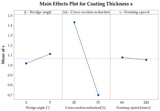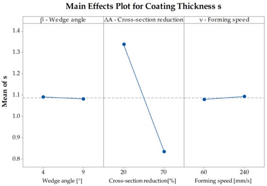 To be able to determine the way the coating thickness changes with a change of the investigated parameters it is necessary to examine the main effects plot (Figure 14). The plot shows that with an increasing cross-section reduction the coating thickness decreases from at to at . Since the wedge angle and the forming speed are not significant to the coating thickness after CWR, there is only a minimal difference between and as well as between and .