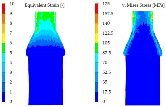 For every analyzed parameter configuration, the coating thickness decreased after CWR. The most obvious change took place at the cross-section reduction of whereas the decrease at reduction is less visible. The equivalent strain and the von Mises-Stress shortly before the forming process is finished are shown in Figure 9 exemplarily for the simulation with a wedge angle of , a cross-section reduction of , and a forming speed of .
